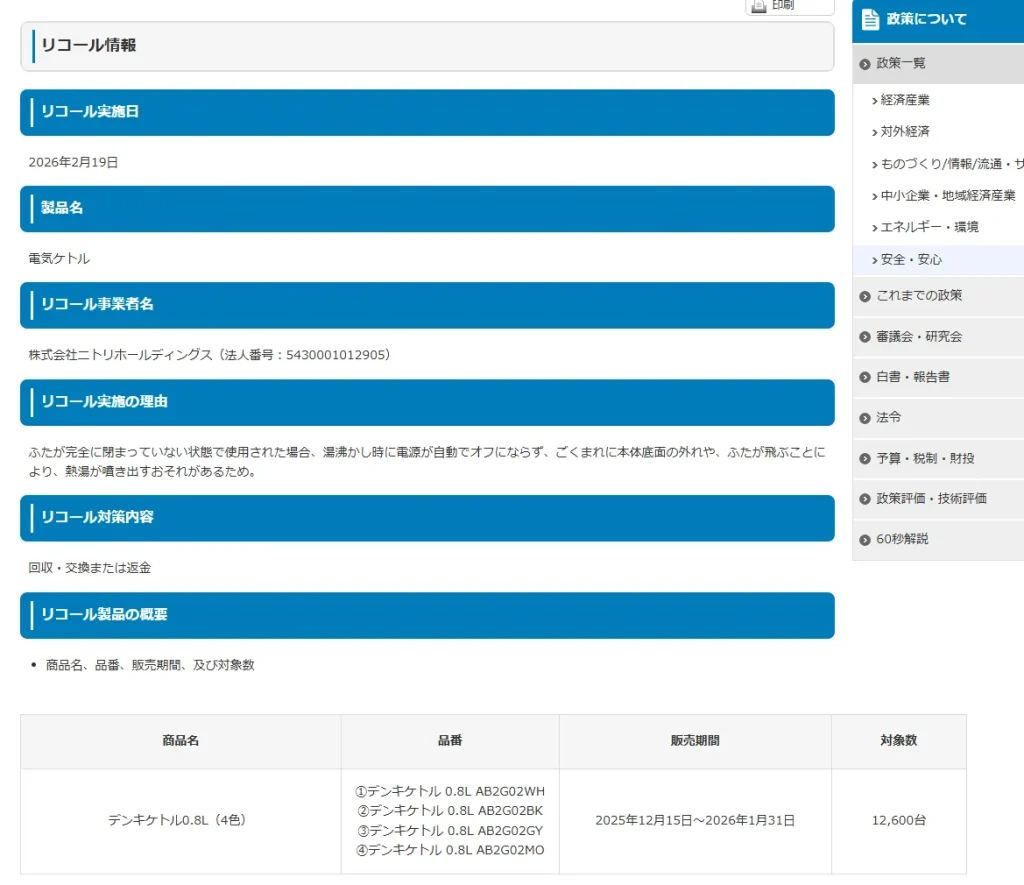 PSE違反の本当の怖さは、罰金ではなく「販売後の事故とリコール」にあります。これを象徴するのが、2026年2月19日に公表されたニトリの電気ケトルのリコールです。