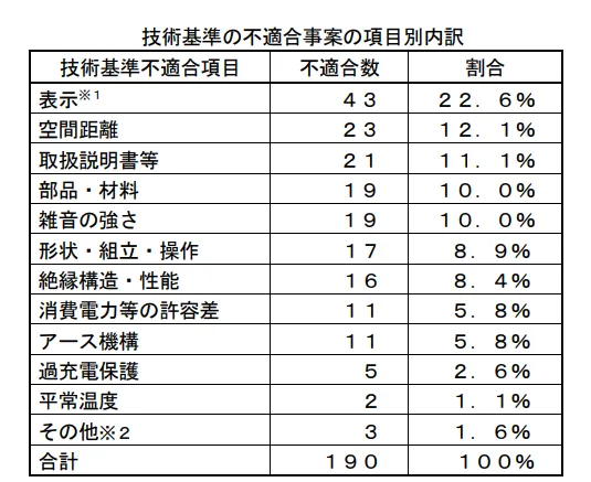 技術基準不適合190件のうち、最も多かったのは「表示」43件(22.6%)でした。