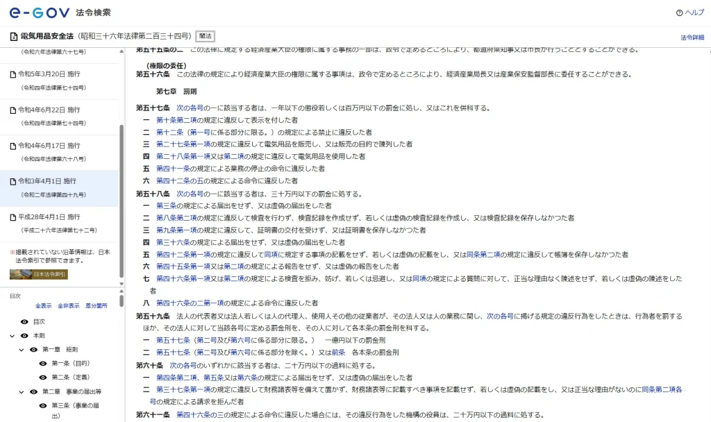 電気用品安全法では、第57条から第60条にかけて、違反行為に対する刑事罰や罰金、過料が定められています。